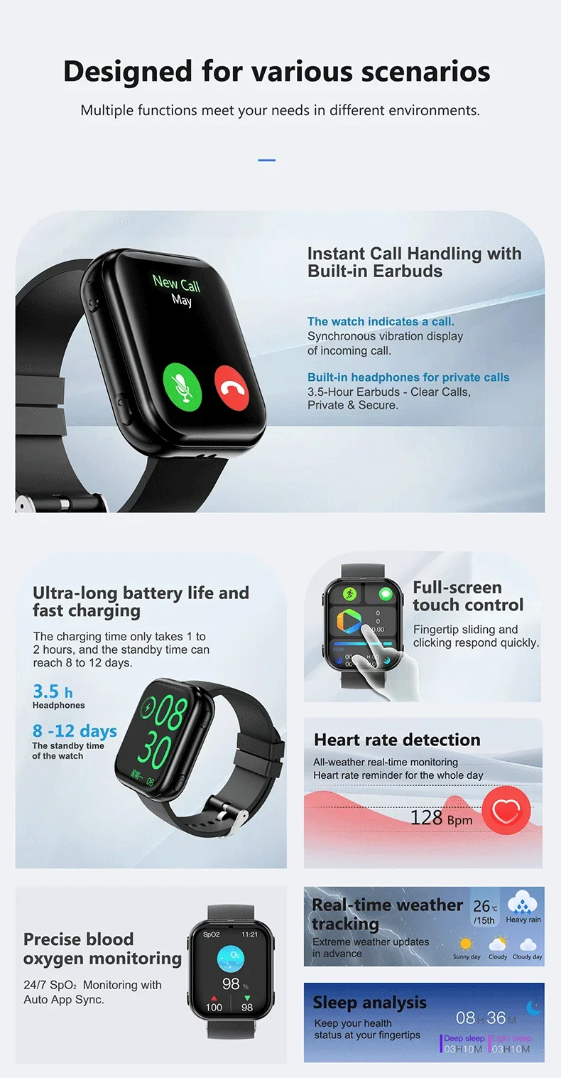 Features:  Bluetooth call, full touch, heart rate, shake and take photos, call reminder / rejection, information storage, Multi Sport mode, weather