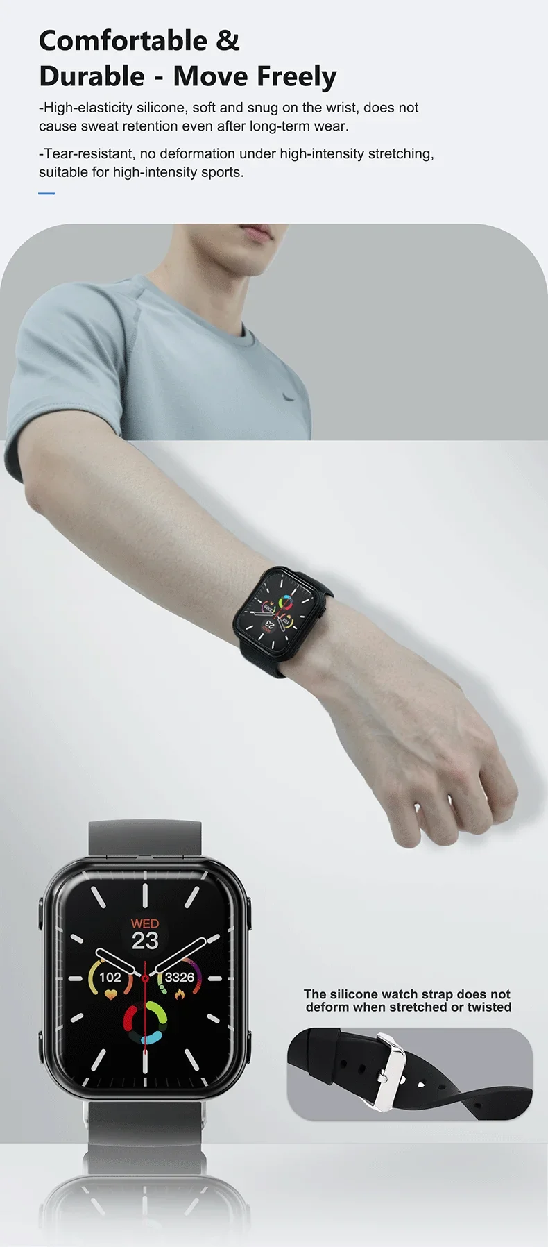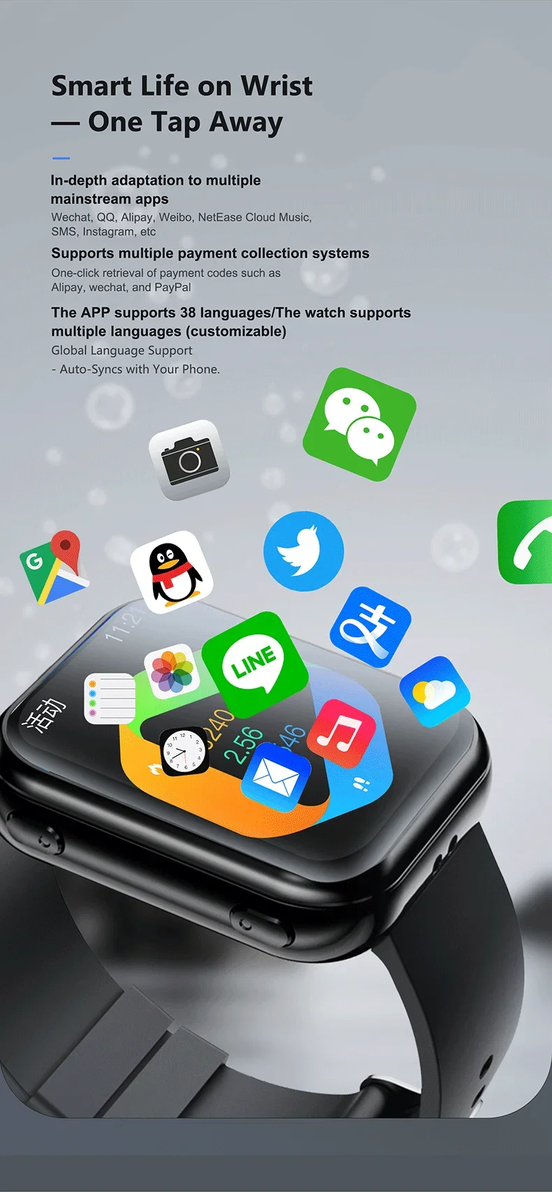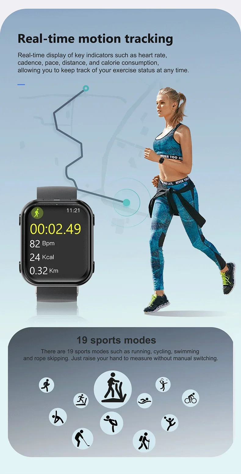 Major functions: multi language, information alert, alarm clock, bracelet, health monitoring, Exercise records (pedometer, calories, mileage), Time, week, date